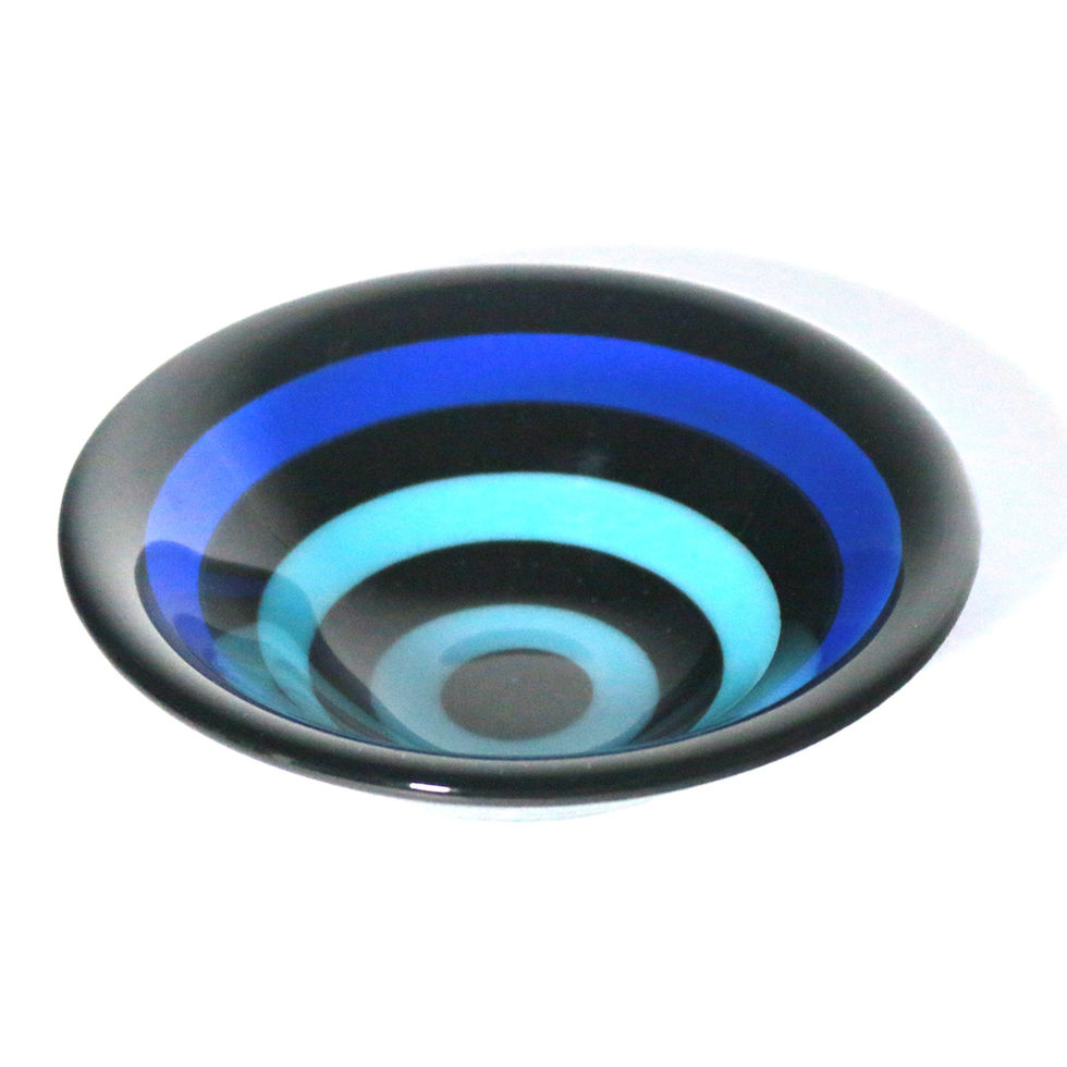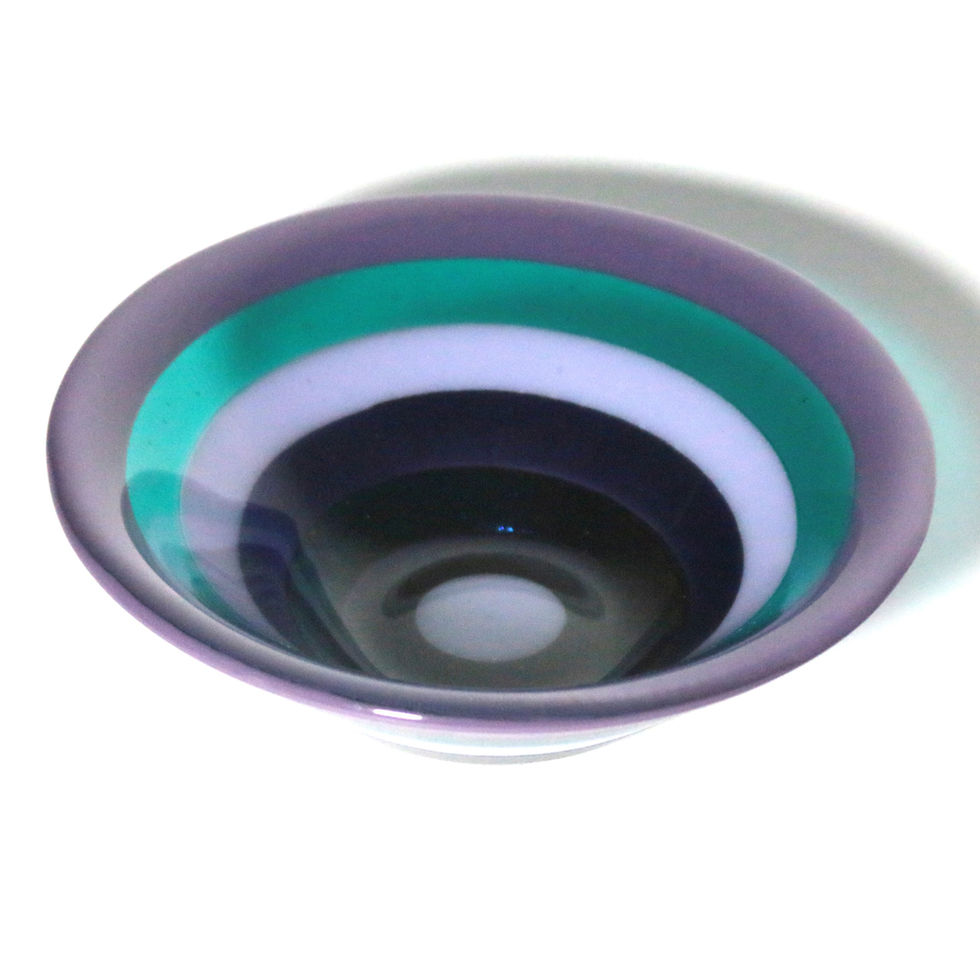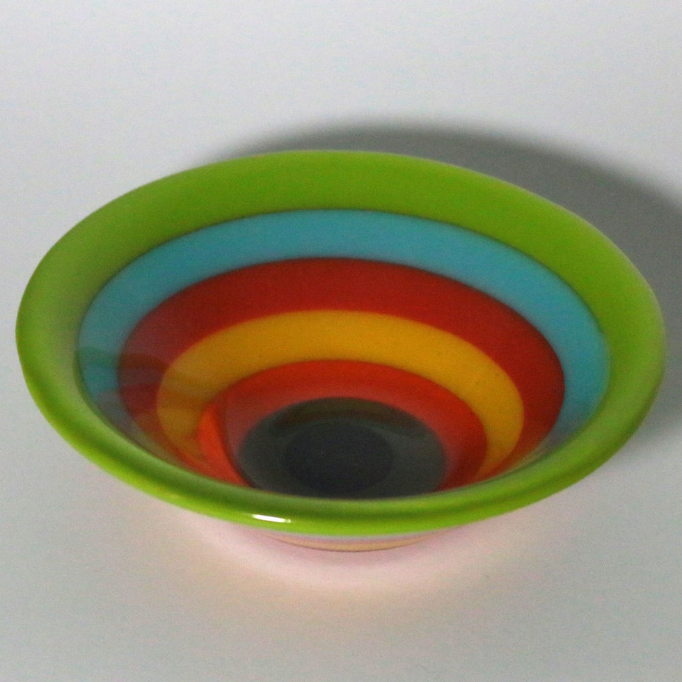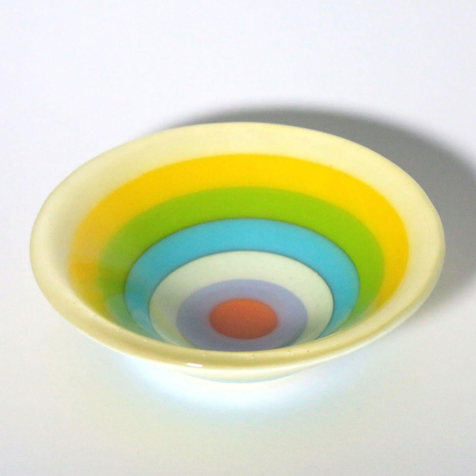 These limited edition gelato bowls were created as part of a body of work exploring "impossible cuts". The process involved waterjet cutting the concentric circles, creating cross-colour combinations from these and reconstructing, layering with clear glass, firing, cold-working and slumping.